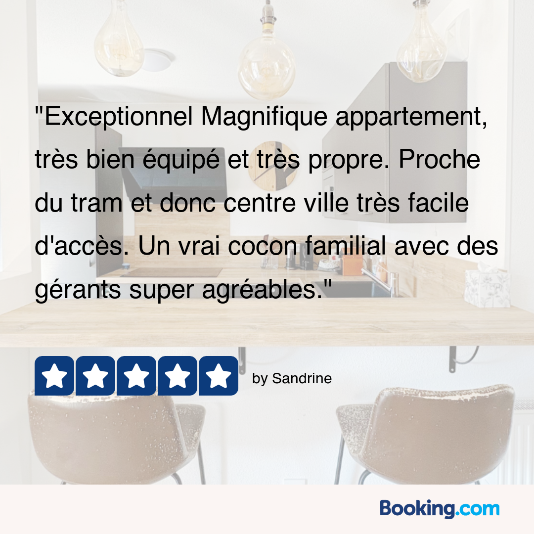 Idéal pour les familles, cet appartement allie confort et praticité. Il dispose d’une chambre double spacieuse, d’une chambre avec lit superposé pour deux personnes, ainsi que d’un canapé-lit dans le salon, permettant d’accueillir jusqu’à 6 voyageurs. La salle de bain est équipée d’une baignoire pour vos moments de détente, avec toilettes séparées pour plus de confort. Une terrasse couverte vous invite à profiter d’un espace extérieur agréable, quelle que soit la saison. Les voyageurs bénéficient d’une place de parking privée et sécurisée, un vrai atout en ville. Situé à proximité immédiate de toutes commodités, l’appartement se trouve au bout de la rue du tramway, offrant un accès direct et rapide au centre-ville et à la gare de Strasbourg. Un logement moderne, pratique et chaleureux pour découvrir Strasbourg en toute sérénité.